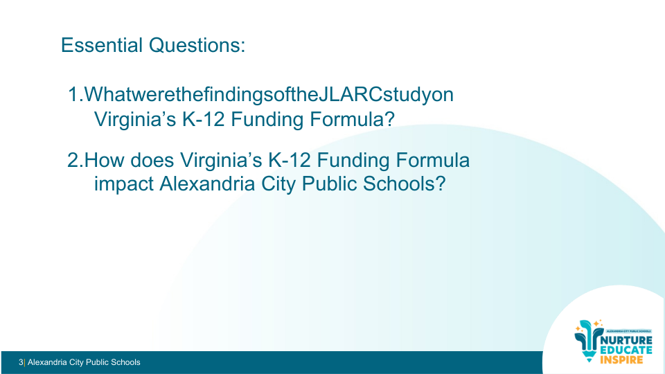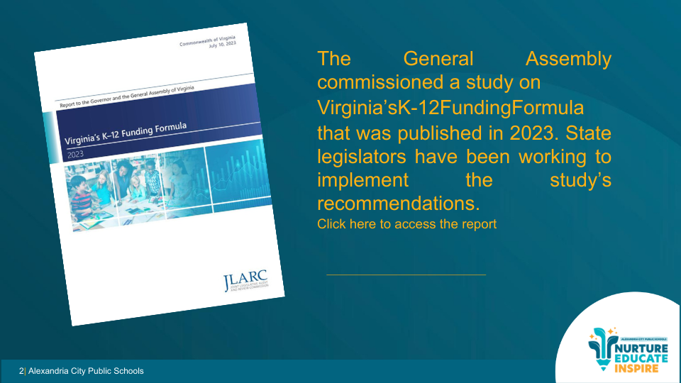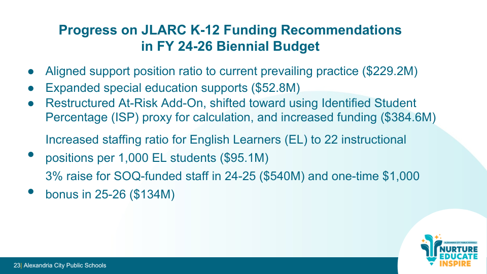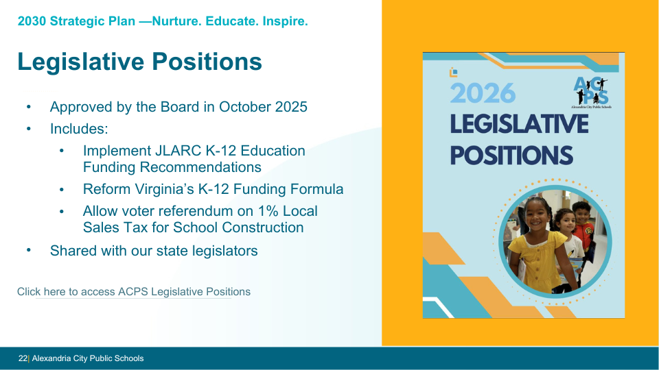 The School Board has adopted legislative priorities that reflect both the JLARC findings and Alexandria’s local context, including: