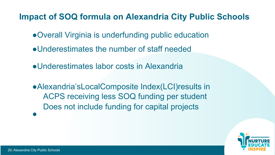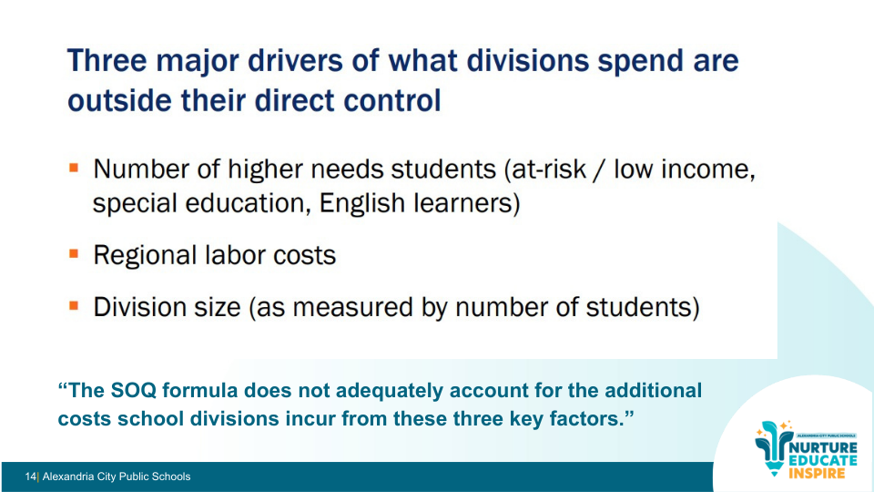 While the funding system underfunds schools statewide, Alexandria is uniquely affected by how the formula masks student needs and high regional costs.