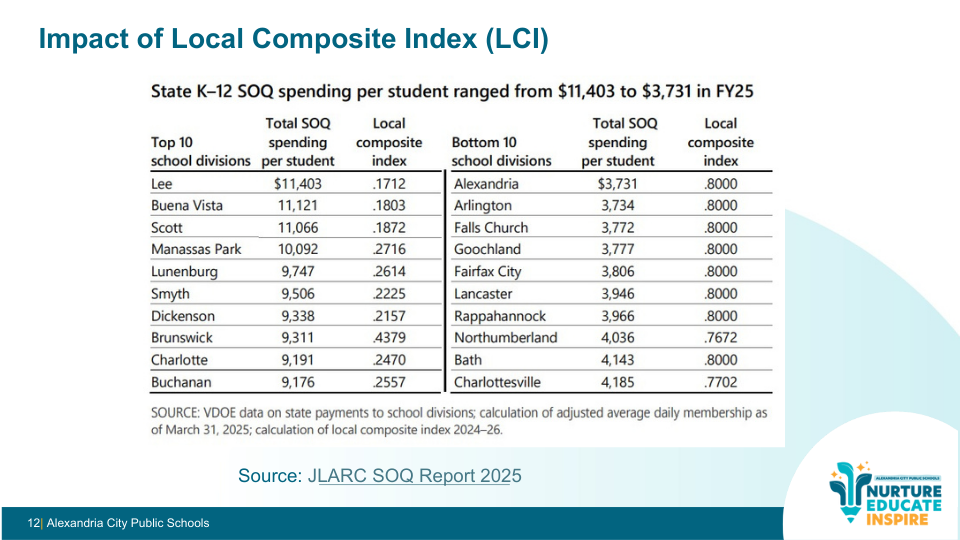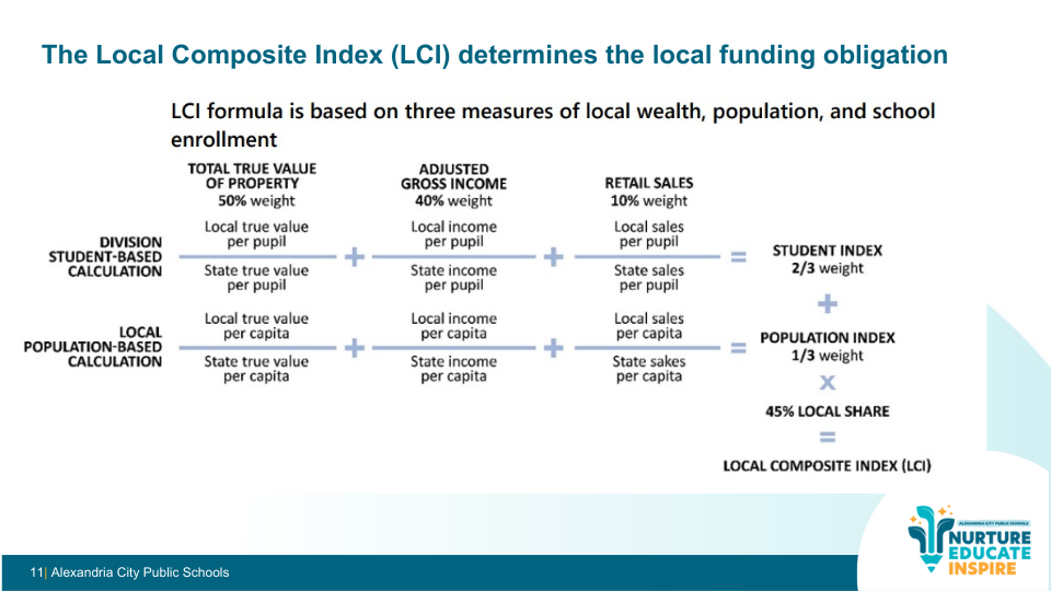 Alexandria has the maximum Local Composite Index (0.8000). That means the state assumes the City can fund roughly 80% of school costs locally.