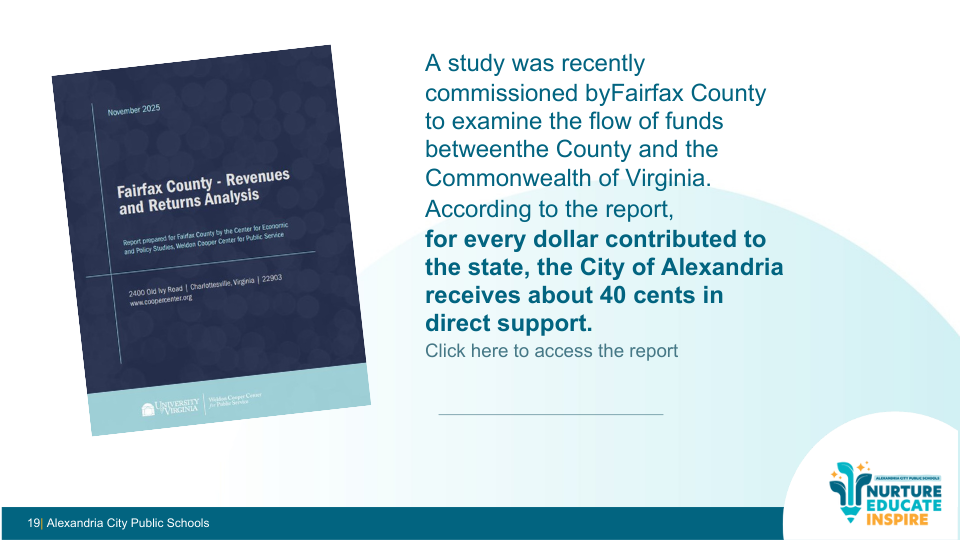 A related regional study found that for every dollar Alexandria sends to the Commonwealth, the city receives about 40 cents back in direct support. Public education funding is a major contributor to that imbalance.