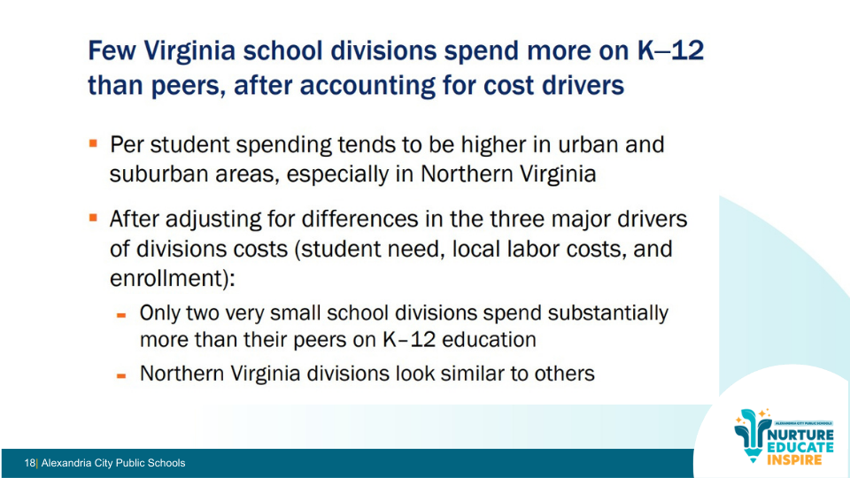 The JLARC study analyzed this specifically and found that after adjusting for student need, local labor costs, and enrollment, Northern Virginia school divisions look similar to others across the Commonwealth.